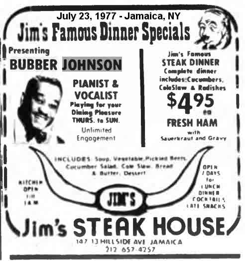 The last time Bubber's name is mentioned as a performer is in July 1977, when he was playing Jim's Steak House in Jamaica, Queens. The photo in the ad was over 20 years old at the time.