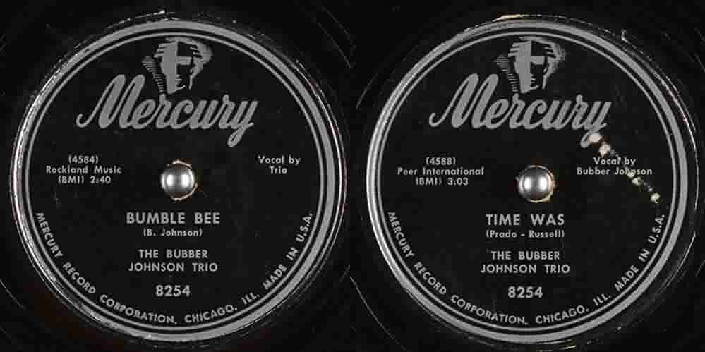 Speaking of 1951, the Trio recorded five songs for Mercury Records around October of that year: "Bumble Bee", "Four Rum Bottles", "You're Driving Me Crazy", "Magic Is The Night", and "Time Was". "Bumble Bee" is a cute, if formulaic, combo performance, with vocals by the entire group (which also played piano, guitar, and bass). "Time Was" had Bubber soloing on the vocals. Those two were released, as the Bubber Johnson Trio, in November 1951 and Billboard reviewed them in its November 24 edition:
