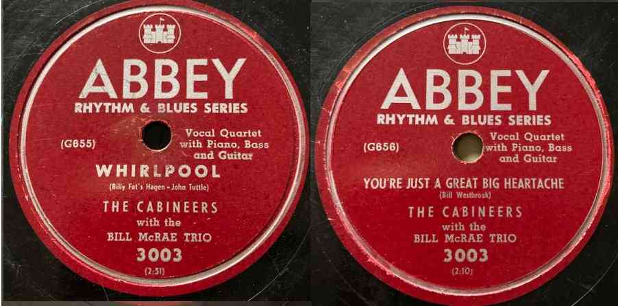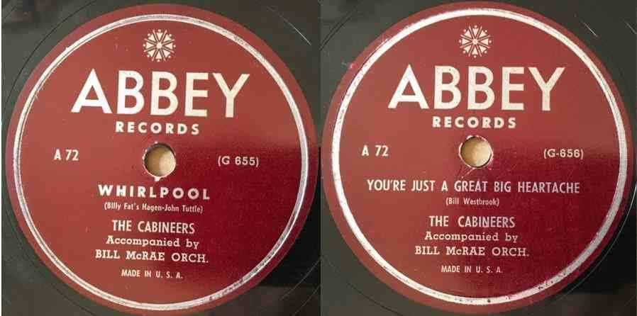 In July or August 1949, the Cabineers held a session for Peter Doraine's newly-formed Abbey label. The four songs recorded were: "How Can I Help It" (led by Maggie, with Bill on the bridge), "Tell Me Now" (led by Bill, with Maggie on the bridge), "Whirlpool" (fronted by Maggie), and "You're Just A Great Big Heartache" (also Maggie).