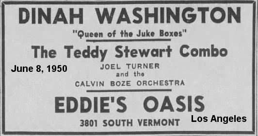 By November 4, he and Dinah Washington, appeared at the Club Riviera in St. Louis. November 8-9 found them at the Roosevelt Theater in Pittsburgh. On November 14, they were at the Bijou in Nashville; the next night it was the Lyric Theater in Lexington, Kentucky. They were still together when they played Memorial Hall (Lima, Ohio) on December 30 and the Armory in Akron, Ohio on New Year's Eve. As far as I can tell, this was the last appearance Calvin ever made outside Los Angeles.