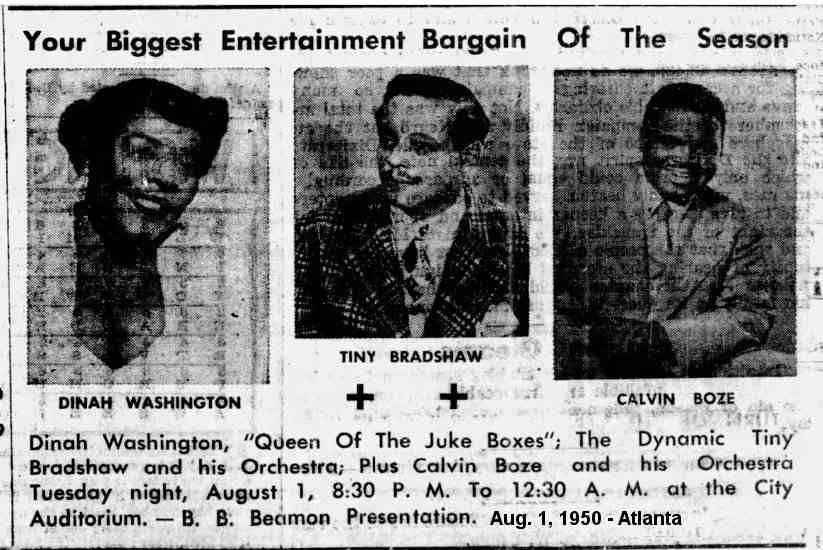 Headlining the pack will be Dinah Washington; the Ravens; Arnett Cobb's band; Foxx and White, comedians [Redd Foxx and Slappy White]; Harold King, roller skater; plus Eddie (Mr. Cleanhead) Vinson. [However, the Earle ad didn't have Calvin's name.]