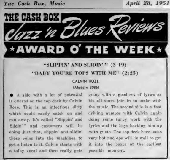 When that one failed to take off, Aladdin issued "Slippin' And Slidin'", backed with "Baby, You're Tops With Me", a Louis Jordan sound, in April. It received Cash Box's "Award O' The Week" in their April 28 edition. Billboard reviewed it on May 5: