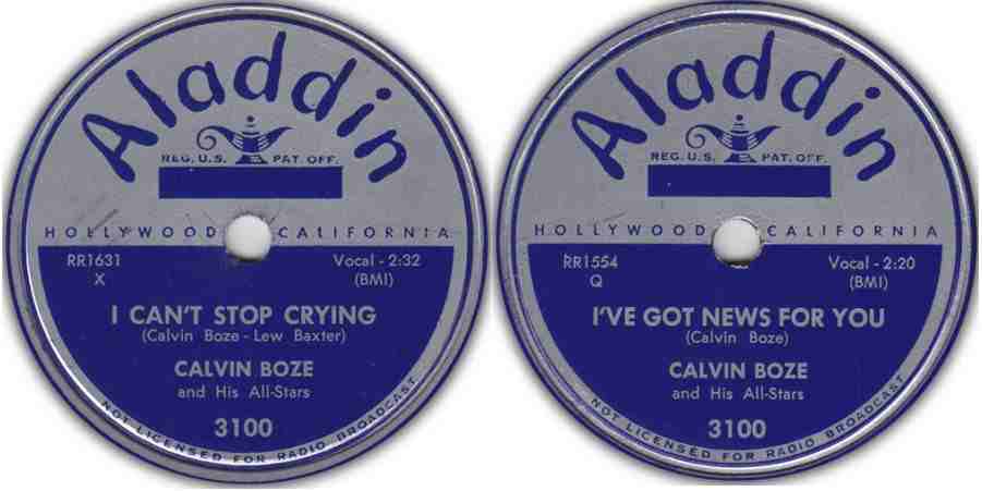 The first half ["News"] is a fast moving jump item that has shown itself a solid contender. Calvin Boze belts this tune across with a driving vocal that insures lots of play. Flip is a fair blues number that is aided greatly by a fine musical backing and interlude. We give our nod to the top lid.