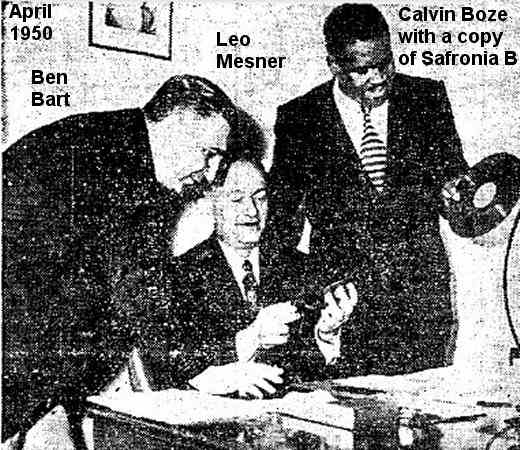 When this failed to take off, Aladdin released "Safronia B", backed with "Angel City Blues" in April. This would become Calvin's only national hit, reaching #9 on Billboard's "Most Played Juke Box Rhythm & Blues Records" chart on June 10. In spite of this, it wasn't reviewed in any trade publication. [Note that most of the lyrics to the song were "borrowed" by the Bayou Boys (Lloyd 'Fatman' Smith and Eddie Jefferson) in their 1952 Checker recording, "Dinah".]