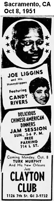 In between those appearances, this appeared in the April 17 San Francisco Examiner: "New music crew Monday at Fack's [in San Francisco] - Joe Liggins and His Honeydrippers with chantoosey Candy Rivers." They started on Monday, April 19, and were still there on May 22 (but her name wasn't in any ads). However, this conflicts with the previous ads at the 49'er. Since she'd done that recording with Liggins the prior month, it was possibly an attempt to get back with him; but nothing came of it.