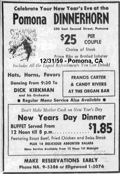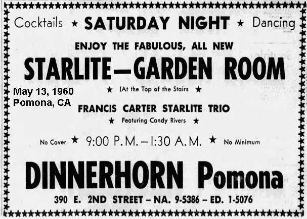 Again, she disappeared for a long stretch, not re-emerging until New Year's Eve 1959, when she was at the Dinnerhorn in Pomona, California (east of Los Angeles). This time, she was with the Francis Carter Trio. They were either back there in mid-May 1960 or they had never left (although there were no ads in the interim). This time, however, they were mentioned up until June 18.