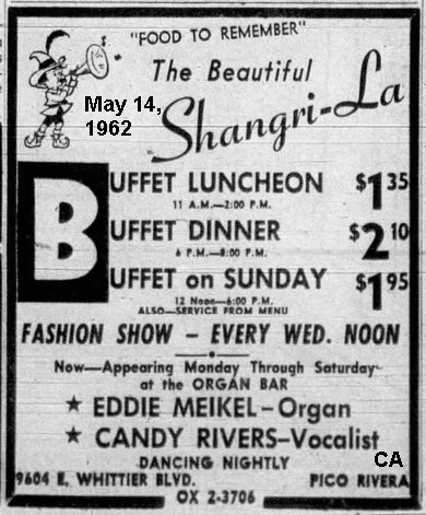Beginning May 14, 1962, Candy appeared, along with organist Eddie Meikel, at the Organ Bar of the Shangri-La in Pico Rivera, California (southeast of L.A.). It said they were appearing Monday through Saturday, but there was only the one ad.