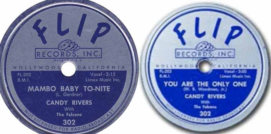 Candy started off 1955 with some recording for the Flip label on January 18. The two known tunes were "Mambo Baby To-Nite" and "You Are The Only One". When the sides were released, in February, the labels credited "Candy Rivers With The Falcons" (although I can't hear a group at all on "You Are The Only One"). I'm sure they're the same Falcons that had "I Need You Darling", on Cash, that same month, as well as "Du-Bi-A-Do", on Flip, also the same month. The disc was reviewed in the April 9 Billboard: