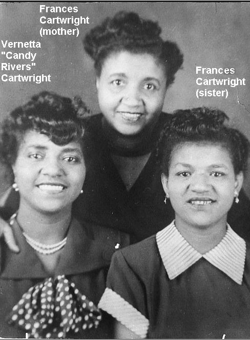 "Candy Rivers" was born Vernetta Ada Cartwright, in Patoka, Indiana, on November 13, 1928. Her parents were Vernet G. Cartwright and Frances Clay. Sadly, her name was misspelled "Vernethia" on her birth certificate.