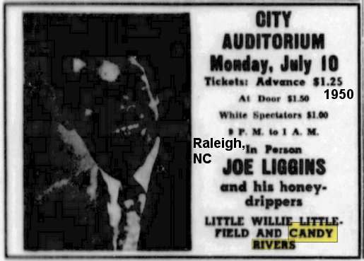Where they did play in July 1950 was the Raleigh, North Carolina City Auditorium on the 10th, along with Little Willie Littlefield. Liggins had, indeed, been going since late April, but Candy wasn't mentioned in any ads before Raleigh.