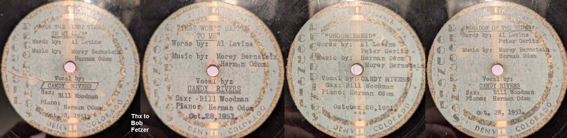 I'm not sure why she was in Denver, but on October 28, 1951, Candy, accompanied by Bill Woodman and his sax, recorded four songs at the Council Recordings studio: "For The First Time In My Life", "That Won't Happen To Me", "Unconcerned", and "Shadow Of The Blues". (They exist as two double-sided demo discs.) Also on the recordings was a pianist named Herman Odom, who wrote the music to all the songs, along with Morey Bernstein. Lyrics were by Al Levine and Peter Geritz; all four were residents of Denver. (Not local hack writers, "Shadow Of The Blues" had been recorded, the prior year, by Dusty Brooks and the Four Tones - the four also wrote the flip of that, "I Ain't Gonna Worry No More". Most important, the four wrote "Today Is Your Birthday" by the Sugar Tones.)