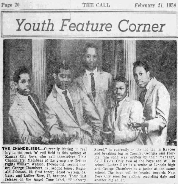 Suddenly, the Chandeliers were a bit more in demand. They played the Municipal Auditorium in Downtown KC (along with a not-too-well-known James Brown), the Prospect Hall, and lots of clubs and theaters between KC and Chicago. There was also Wichita and St. Louis and Lawrence, Kansas. They didn't tour much, but in spite of that, "some of our parents had problems signing to let us travel."