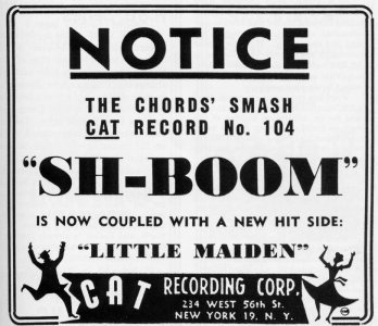 On April 3, Atlantic announced the formation of Cat Records and the signing of the Chords, a "blues quartet". (In the South, R&B was known as "cat music", so the label name was a natural.) When "Cross Over The Bridge" was released on Cat, "Sh-Boom", by all accounts a throw-away song (with some nice sax work by Sam "The Man" Taylor), was grudgingly put on the record as the "B" side.