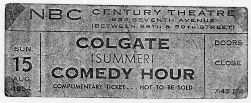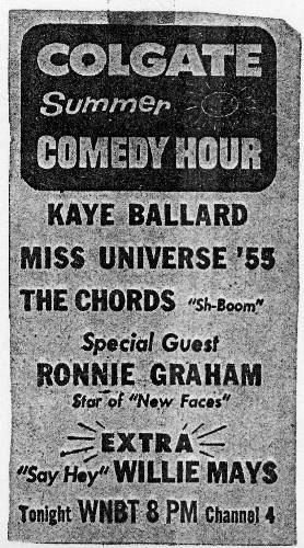 Actually, the reason that they were in New York that day is because they'd hit the big time. Through the efforts of Associated Booking, they appeared on the "Colgate Summer Comedy Hour" (with Kaye Ballard, Ronnie Graham, Miriam Stevenson [Miss Universe of 1954, even though the ad said 1955], Peter Graves, and Willie Mays). The show was broadcast live on August 15, 1954 at 8:00 on WNBT, Channel 4. They not only sang "Sh-Boom", but also performed "Say Hey, Willie", with Willie Mays. (Buddy still has the lyrics to the song, which they had to learn for the show.) Said Buddy, "Even the people who used to throw water on us from out their windows [when the group would practice in front of buildings], they were so proud of us." Those people would even brag that they threw water on the Chords before they hit it big! Buddy is proud to say, "We were the first Rock and Roll group on coast-to-coast TV." (This wasn't really true, although the Chords would have been one of the first R&B groups ever seen on network television. Probably the first was Tiger Haynes and the Three Flames, who had their own NBC summer show in 1949.)