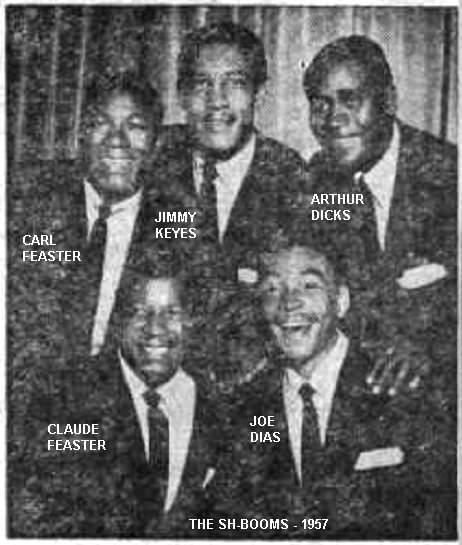 Buddy was replaced by baritone Vernon "Arthur" Dicks (sometimes seen misspelled as "Dix"; he'd been with Jimmy Keyes' 4 Notes group back in 1950 as both "Arthur Vernon" and "Arthur Dixon"). At the time, Arthur was a soloist, performing in niteclubs. William Edwards' place was taken by Joe "Ditto" Dias, who'd been an on-and-off member of the group previously (before their recording days), and who had also been with Dean Barlow in the Crickets and the Bachelors. (Another singer who hung around with the Chords was Bobby Spencer, but he only appeared with them once, at Chubby's in Camden, New Jersey, replacing Claude for a week.) Thus, the Sh-Booms were now: Carl Feaster (lead tenor), Jimmy Keyes (first tenor), Claude Feaster (baritone), Arthur Dicks (baritone), and Joe Dias (bass).