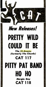 Their last record on Cat was issued in October 1955 as by the "Sh-Booms": "Could It Be", coupled with "Pretty Wild". The disc was reviewed (both sides "good") on October 29, along with Shirley & Lee's "Lee's Dream", the Cadillacs' "Speedo", the Turks' "Emily", Little Richard's "Tutti Frutti", the Rolling Crew's "Home On Alcatraz", the Orioles' "Please Sing My Blues Tonight", the Diablos' "The Way You Dog Me Around", the Medallions' "My Pretty Baby", and the Meadowlarks' "This Must Be Paradise".