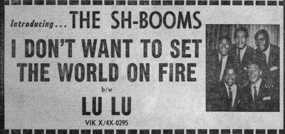 Instead, on August 22, 1957, the Sh-Booms recorded three sides for RCA's Vik subsidiary: "I Don't Want To Set The World On Fire" (led by Joe Dias), "Lu Lu" (fronted by Carl Feaster), and "Don't Be Mad At My Heart" (also Carl). The first two were issued on Vik in September 1957. Reviewed on September 30, they were both ranked "good" along with Clyde McPhatter's "Rock And Cry", Fats Domino's "Wait And See", Frankie Lymon's "My Girl", and the Spaniels' "You're Gonna Cry".