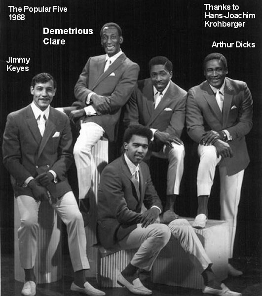 And that was it for the Chords/Chordcats/Sh-Booms. In late 1967, Jimmy Keyes formed the Popular 5: Warren Wilson (lead), Jimmy Keyes (first tenor), Jessie Huddleston (first tenor), Arthur Dicks (baritone) and Dimitrios Clare (bass; he'd been in Jimmy Keys' 4 Notes and then the Continentals on Rama). They even went as far as incorporating (on September 12, 1967, as The Popular Five, Inc.) with Keyes as the president and Clare as the secretary/treasurer. This group cut "Sh Boom" for Rae Cox and also had releases on Minit and Mister Chand. In addition, there were a couple of Shaefer Beer commercials and appearances at the Shaefer Festival in New York's Central Park.