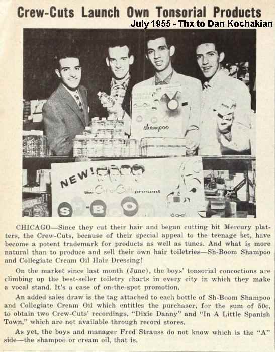 Here's how influential the Chords had become: by November 1954, in Oshkosh, Wisconsin, there was a women's bowling team called the "Sh-Booms". (OK, they were in last place, but still, an honor is an honor!) By August 1955, there was a Sh-Boom shampoo (manufactured, sadly, by the Quartet Chemical Company, owned by the Crew Cuts!).