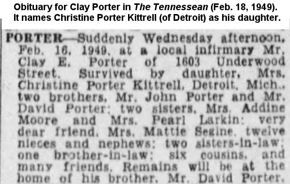 When Clay Porter died in February 1949, his obituary named "Mrs. Christine Porter Kittrell, Detroit, Mich." as his daughter.