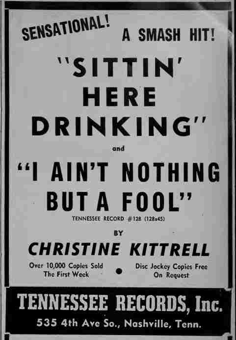 Her next Tennessee record, "Sittin' Here Drinking" and "I Ain't Nothing But A Fool" was released in July 1952 (and this time they remembered to send it to the trade publications). Both Cash Box and Billboard reviewed it on August 2.
