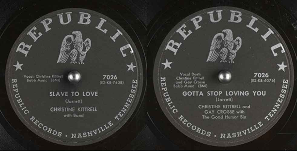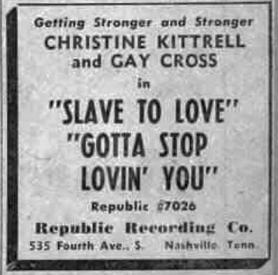 Republic Records ... have also inked Christine Kittrell, formerly with Tennessee Records, and who is well known for her "Sittin' Here Drinking." Kitty is being paired with Gay Crosse and the pair will cut "Gotta Stop Lovin' You" shortly.