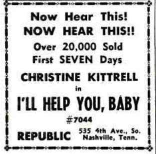I'll Help You Baby (75): Christine Kittrell turns in a very good vocal on this doleful blues melody, selling it with a lot of feeling. The ork backs her with a beat. Performance is much stronger than the material, and the spins and plays it gets will be due to the vocal by the thrush.
