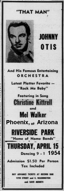 From the April 10 Cash Box: "Johnny Otis heads back to the Coast again for an appearance at the Elks Hall on April 16th. Also on the same billing will be Christine Kittrell and Mel Walker." The night before, the three acts had been at Riverside Park in Phoenix, Arizona. I don't know the date, but they'd also played at Denver's Rainbow sometime in April (also mentioned on that show was Marie Adams).