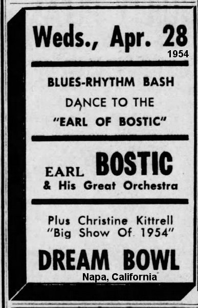Then, she teamed up with Earl Bostic again for some shows in northern California at colleges and military bases. Two that were mentioned were Chico State College on April 27 and Fort Ord the next night. However, that conflicts with an advertisement for an appearance at the Dream Bowl in Napa, California. I suppose they could have done the army base in the afternoon and Napa in the evening.