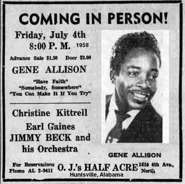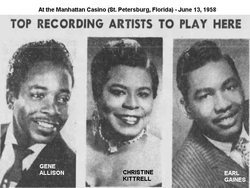 She's not heard from again until June 13, 1958, when she was at the Manhattan Casino (St. Petersburg, Florida), along with Gene Allison and Earl Gaines. On July 4, the same three, plus Jimmy Beck's Orchestra, were at O.J.'s Half Acre in Huntsville, Alabama. (I suppose Beck was at the Manhattan Casino too, but his name wasn't mentioned in the write-up.)