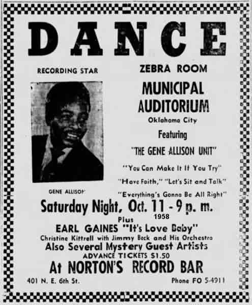 This group must have been touring, since all four acts turned up at the Zebra Room of the Municipal Auditorium in Oklahoma City on October 11. However, there were no advertisements between July 4 and that date. On October 24, they were all at the Macon Auditorium in Macon, Georgia.