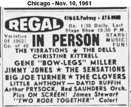 On November 10, 1961 Christine started a week at Chicago's Regal Theater. Also on the bill were the Vibrations, the Dells, the Sensations, Jimmy Jones, Big Joe Turner, the Clovers, Little Anthony, David Ruffin, Arthur Prysock, and the Red Saunders Orchestra.