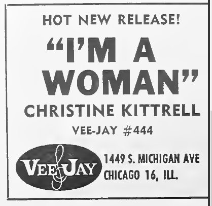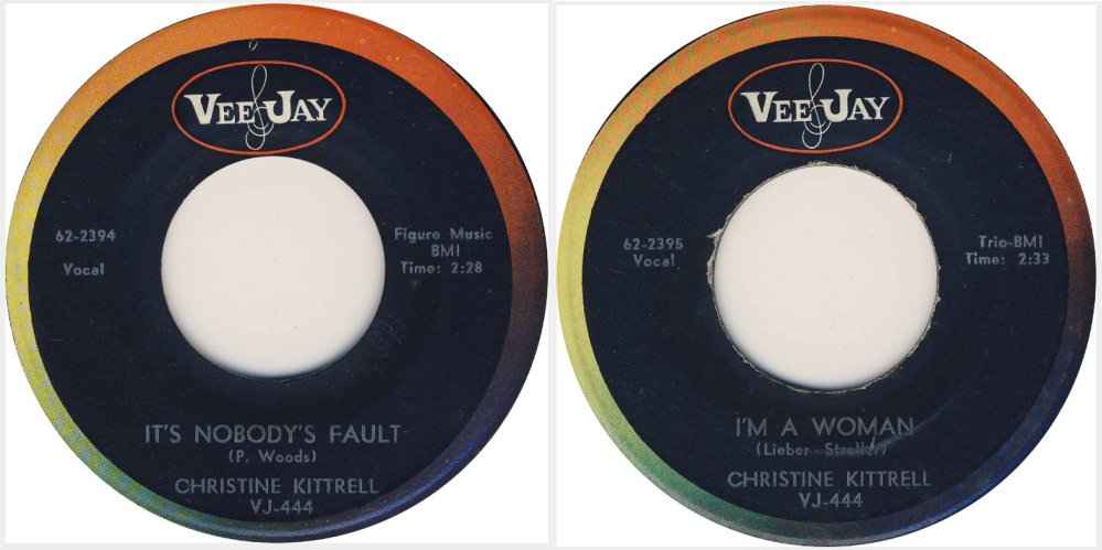 Vee-Jay released "I'm A Woman" and "It's Nobody's Fault" around May 1962. Peggy Lee recorded it soon after and had a #54 hit with the song in early 1963. Although Christine's version never made any charts, she managed to get a lot of work from it in Chicago night clubs.