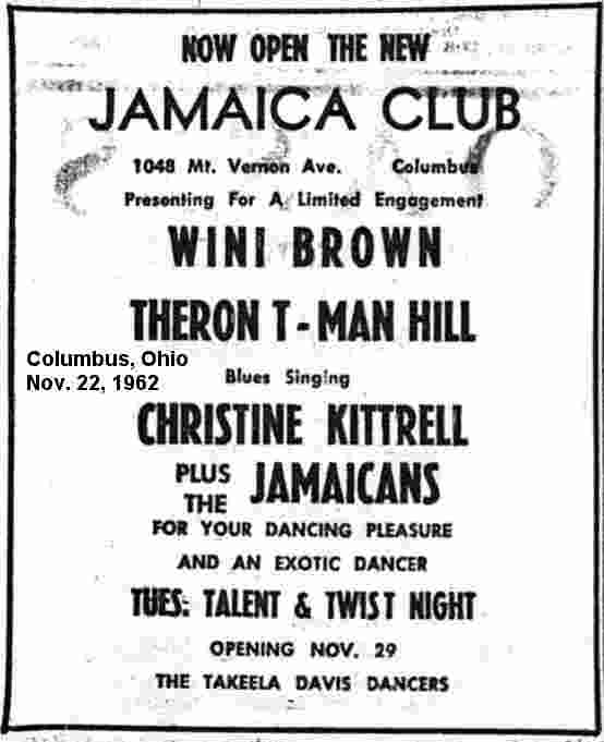 On November 22, 1962, Christine opened at the Continental Room of the Jamaica Club in Columbus. Also on the bill were Wini Brown and Thearon "T-Man" Hill (formerly of the Serenaders). She, but not the others, continued there until at least December 19.