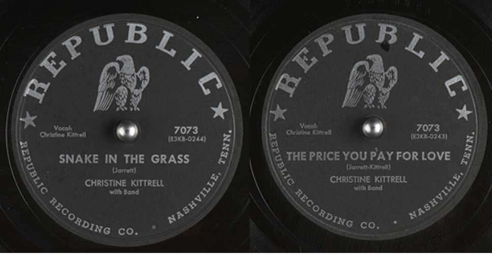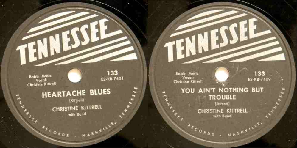 In November, Tennessee released her next record: "Heartache Blues", coupled with "You Ain't Nothing But Trouble". The top side was written by Christine; the flip by Ted Jarrett. Unfortunately, by the end of 1952 Tennessee Records was closed down and reformed by Bill Beasley as Republic Records, so the disc was never sent to the trades for review.