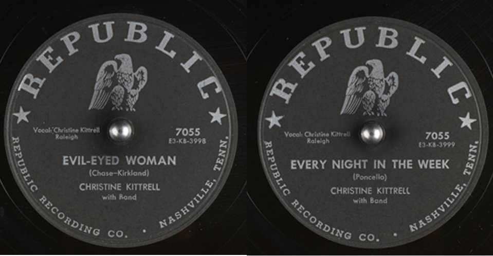 Her next Republic release, from September 1953, was "Evil-Eyed Woman", another bluesy ballad. It's an interesting song, since she doesn't really sound evil (unlike, for example, Dinah Washington doing "Evil Gal Blues"); it really sounds more like she's putting up a false front. The flip was "Every Night In The Week". Both songs feature the band of Guitar Red (Paul Johnson) and the Hot Potatoes, but the record was never sent out for review.