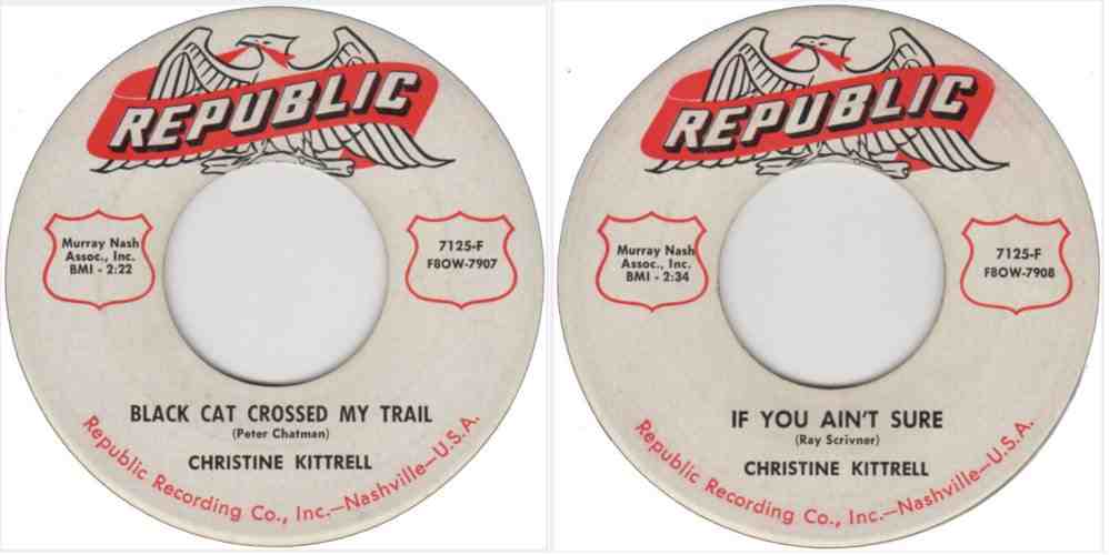 In December 1955, Republic issued "Black Cat Crossed My Trail" and "If You Ain't Sure" on their newly-designed label. They were reviewed in the January 7, 1956 Cash Box (both rated "B"):