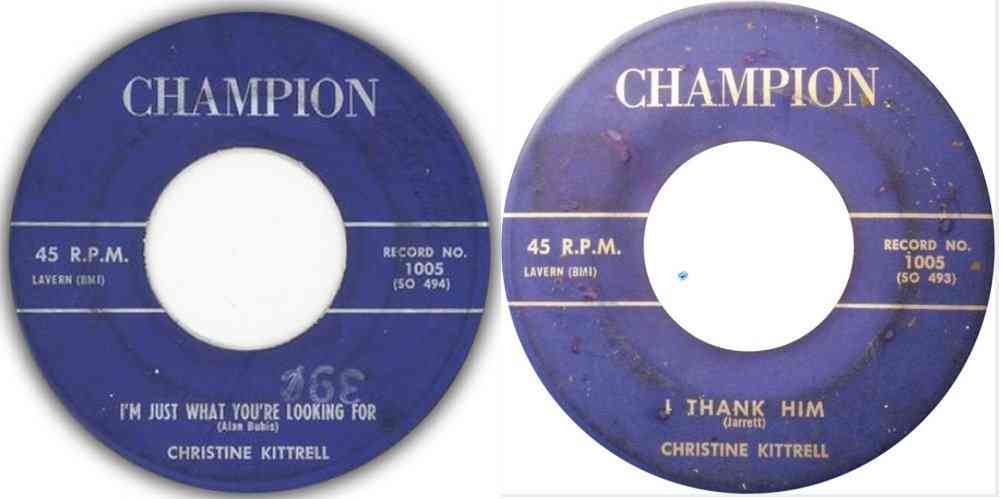 Probably at the end of 1958, Christine recorded some more songs back in Nashville: "I'm Just What You're Looking For" and "I Thank Him". They were released on the Champion label around February 1959. Champion was owned by old friends Alan and Reynold Bubis, with Ted Jarrett as a&r man.