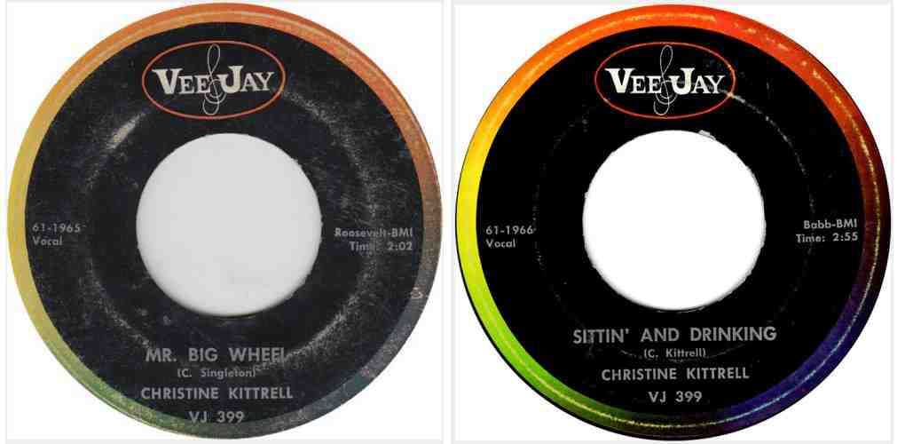 Probably over the summer of 1961, Christine recorded a couple of songs for Vee-Jay: "Mr. Big Wheel" and a reprise of "Sittin' Here Drinking", this time called "Sittin' And Drinking"; these were released in September. Note that the Vee-Jay house band had guitarist Lefty Bates, former member of the Aristo-Kats.