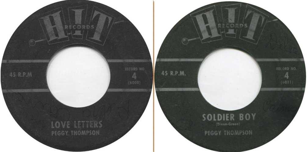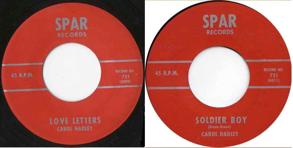 Sometime in early 1962, Christine recorded "Love Letters", a cover of the Ketty Lester hit. Bill Beasley and Alan Bubis had started a couple of el-cheapo labels (Hit and Spar) to handle these kinds of covers. As far as I can tell, the song was released on both labels around March 1962. On Hit, she was billed as "Peggy Thompson" and on Spar as "Carol Hadley". The flip side on both labels was a cover of the Shirelles' "Soldier Boy", but not by Christine, even though the same artist name was used.