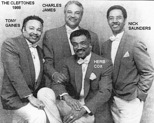 Charles finally quit around 1993, leaving a trio once again. This continued for another three years, until Tony Gaines passed away. To keep the Cleftones going, Herb recruited two second tenors, Kenny Whiteside and Mac Todd.