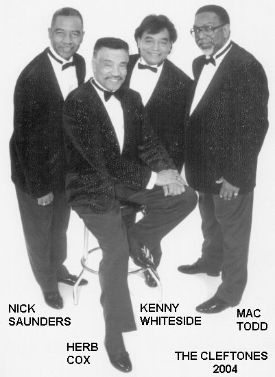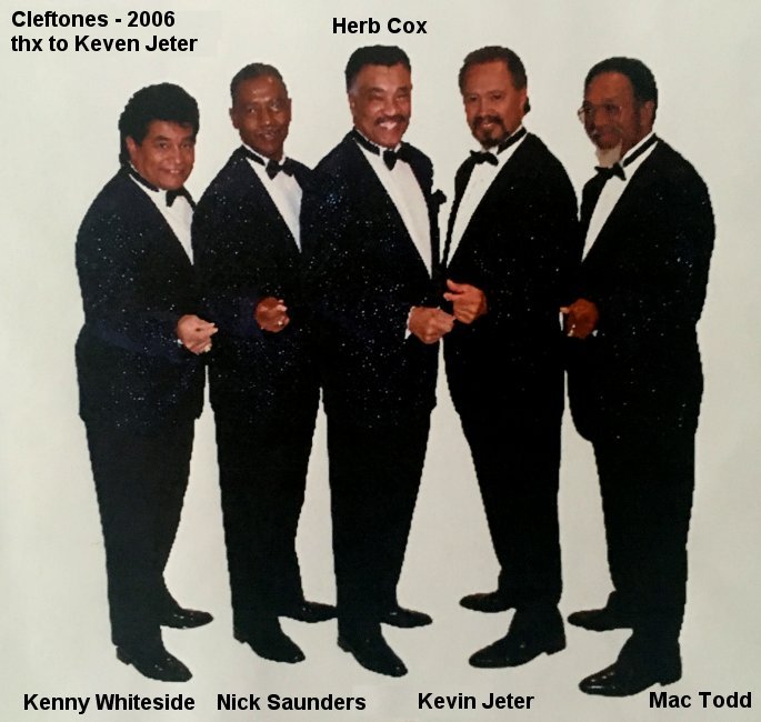 In 2007, Herb's Cleftones are still out there (and busy!). For about ten years, the group was a quartet, consisting of Herb Cox, Kenny Whiteside, Mac Todd, and Nick Saunders. However, a couple of years ago, they decided that they really needed a fifth voice to emulate the sound of the classic Cleftones. Remember back in 1954 when the pre-Cleftones had included the Jeter brothers? Well, when they practiced at the Jeter house, there was another, younger, brother who sat on the steps and listened. Just to bring things full circle, Kevin Jeter, that same little kid, joined them as a second tenor in 2004.