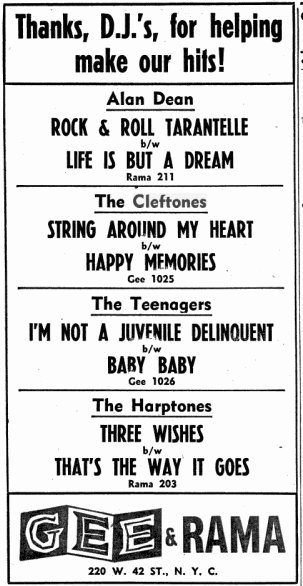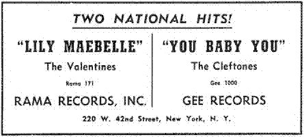 "Little Girl Of Mine" did well enough to secure the Cleftones a spot on Alan Freed's 10-day "Easter Jubilee Of Stars" at the Brooklyn Paramount. (No, I won't make any more cynical remarks about the Freed-Levy-Kahl-Kolsky-Goldner connection.) Other Rama/Gee stars on the show were the Teenagers and the Valentines (still no cynical remarks). Also present were the Platters, the Rover Boys, the Willows, the Royaltones, the Jodimars, Ruth McFadden, Cindy & Lindy, and Dori Anne Grey.