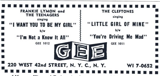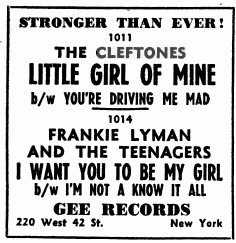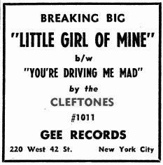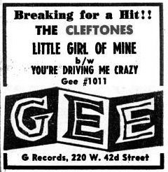 In March, 1956, Gee released the second Cleftones record: "Little Girl Of Mine" (led by Herb, along with another frenetic Jimmy Wright tenor sax solo), backed with "You're Driving Me Mad" (a Herb and Berman duet lead, on which they sound a bit like Robert & Johnny).