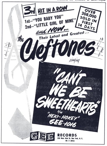 "Can't We Be Sweethearts" was ranked "excellent" by the trades on June 23, 1956 (which seemed to validate the Cleftones quitting school). Other reviews that week were for the Teen Queens' "Billy Boy," Shirley & Lee's "Let The Good Times Roll," the Heartbeats' "Your Way," the Orioles' "Happy 'Till The Letter," the Empires' "Don't Touch My Gal," the Bop-Chords' "Castle In The Sky," the Kool Gents' "This Is The Night," the Robins' "Merry-Go-Rock," and the Rip-Chords' "Let's Do The Razzle Dazzle."
