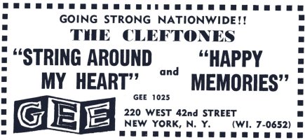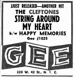 Sadly, sometime after "String Around My Heart," management decided that the "teenage" sound of Gee records was past its peak and had to change. Now, there were no longer any frenetic Jimmy Wright sax breaks in any of the Cleftones' tunes. He went on to (hopefully) bigger and better things, but the Cleftones missed him.