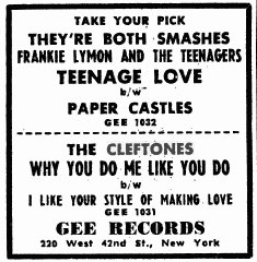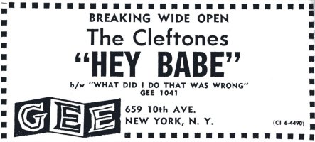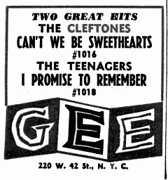 What really got the Cleftones noticed was the political arena at Jamaica High. There were two parties: the Red & Blue (the "jocks") and the Independents (the "nerds"). The elections for G.O. president were coming up and the faculty wanted the Cleftones to get involved (certainly not by singing that raucous R&B junk, however). To help out the Independents (who hadn't won an election in about a decade), the Cleftones worked on a slogan. They took "Gee," which had just wound up its phenomenal chart run and re-worked the lyrics: "Oh-oh-oh-oh-oh Gee/Vote for I-N-D" (yes, Herb still remembers the whole song!). So much for not singing that raucous R&B junk!