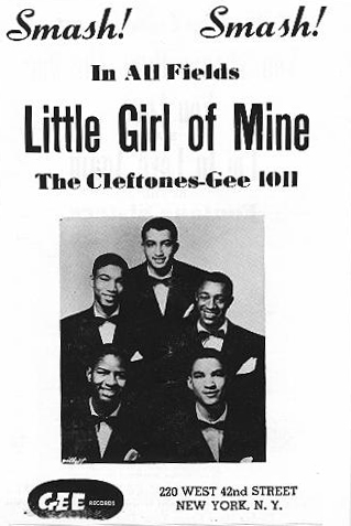 Where did the "diddle-liddle-liddle-liddle-lit" come from in "Little Girl Of Mine"? According to Charles James: "In the early days of the Cleftones, we were not that well versed in hearing notes or harmonies. Therefore, because of the tin ears, we usually had to have something to cue us for the correct notes. Well, that fact paid off big for us because our early (first three) recordings were "cold" bring-ins and in order to get into "Little Girl of Mine," we had a step-one-note-at-a-time usage (diddle, lit, etc.) to make sure we knew where we were (with Warren's bass injected to keep the rhythm before doing the start of the song). It originally was not part of the song. George Goldner insisted that we leave the whole thing in there and it wound up to be the second biggest seller of all our records and George always reminded us it was because of that beginning. Moral?... sometimes what you are doing to try to make it work... makes it work!"