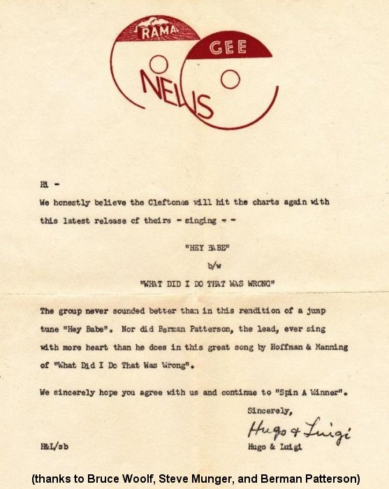 On August 30, 1958, The San Bernardino County Sun ran an article entitled "Musical 'Believe It Or Not'" that contained this interesting paragraph: "The first rhythm and song [sic] to achieve the number one spot in the popular field was 'Gee' by the Cleftones on Rama (about 1951)." I'm not even sure what kind of a comment to make.