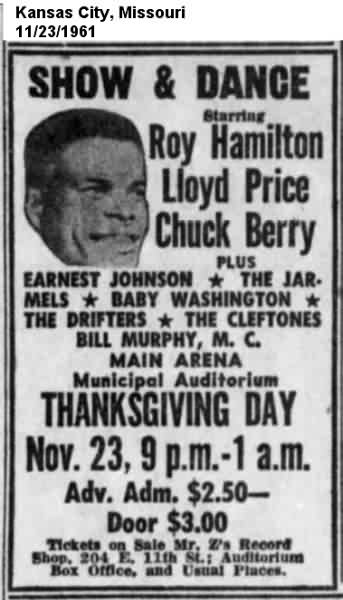 The Cleftones' last week at the Apollo Theater began on October 21. The other acts were Jerry Butler, the Miller Sisters, Maxine Brown, Bobby Lewis, the Blue Notes, and Doc Bagby's Orchestra. On Thanksgiving Day, they appeared at the Municipal Auditorium in Kansas City, Missouri, as part of a show featuring Roy Hamilton, the Jarmels, Baby Washington, and the Drifters (who were pretty far down in the billing).